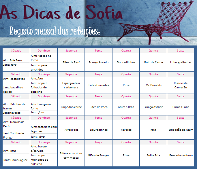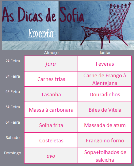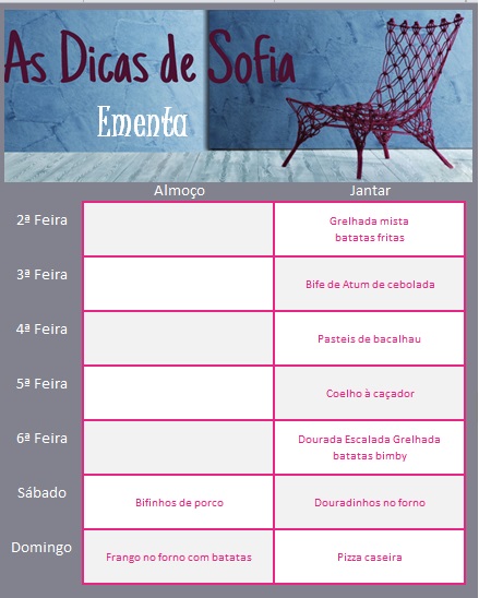 Almoço: carne/peixe/ovos com 2 batatas pequenas/3 colheres de sopa de arroz/3 colheres de sopa de leguminosas (feijão frade, feijão vermelho, grão, ervilhas) e legumes confecionados/salada à vontade.