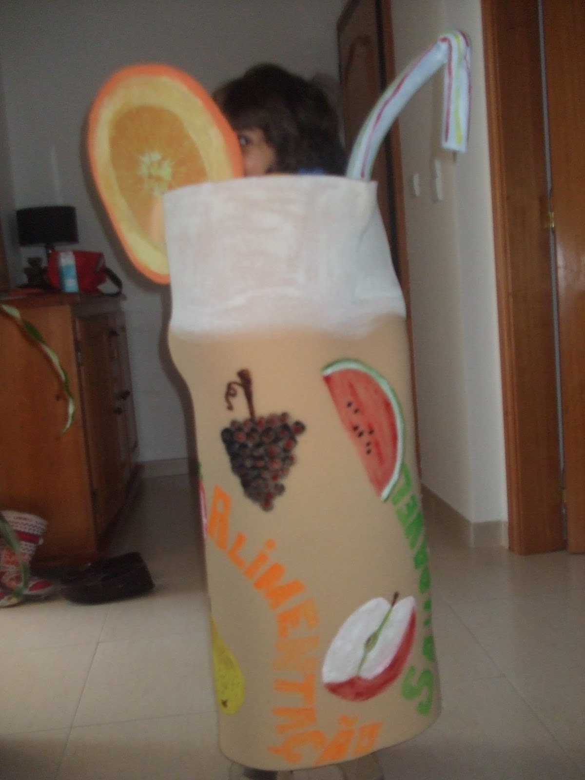Chegámos ao Carnaval e o tema da escola da pulga era "Alimentação Saudável". Mãos à obra para criar um copo de sumo cheio de vitaminas, (que só tem um braço, o outro estava partido :():
